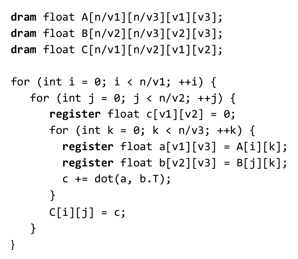 for (size_t i = 0; i < TILE; i++) { for (size_t j = 0; j < TILE; j++) { for (size_t k = 0; k < TILE; k++) { out[i * TILE + j] += a[i * TILE + k] * b[k * TILE + j]; } } } }